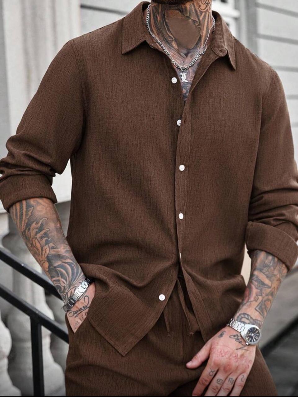 Homme Men Solid Color Textured Fabric Front Button Casual Linen Long Sleeve Shirt, Fall Black And Khaki Shirt Men Rust Color Shirt Men Casual Long Sleeve Shirts Dark Brown Shirt